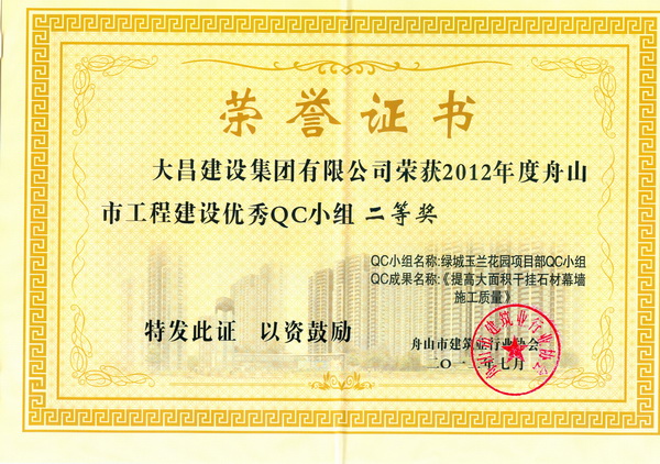 2012年绿城玉兰花园项目部QC小组获舟山市工程建设优秀QC小组二等奖